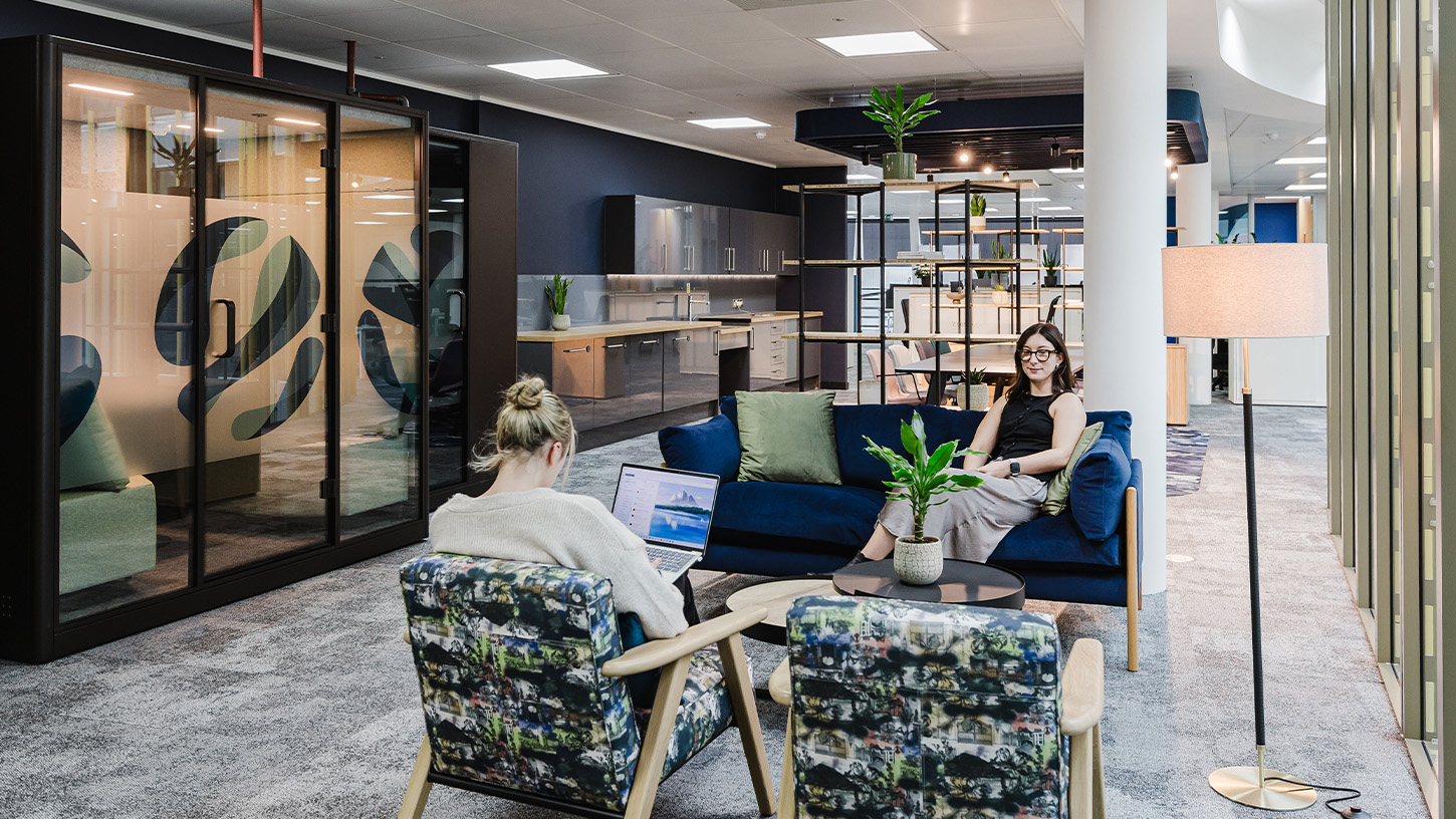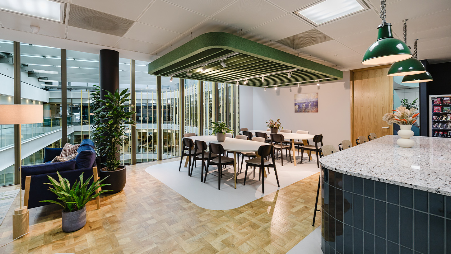 Creating a strong first impression was central to the design. A bright, airy new reception welcomes staff and visitors, with a client welcome area framed by feature wood dividers that add warmth and texture. A standout breakout lounge overlooks the atrium, flooded with natural light from the full-height windows. The space blends functionality with comfort, offering both a kitchen for lunches and soft seating that provides the perfect informal spot for a quick catch-up or coffee with a client.