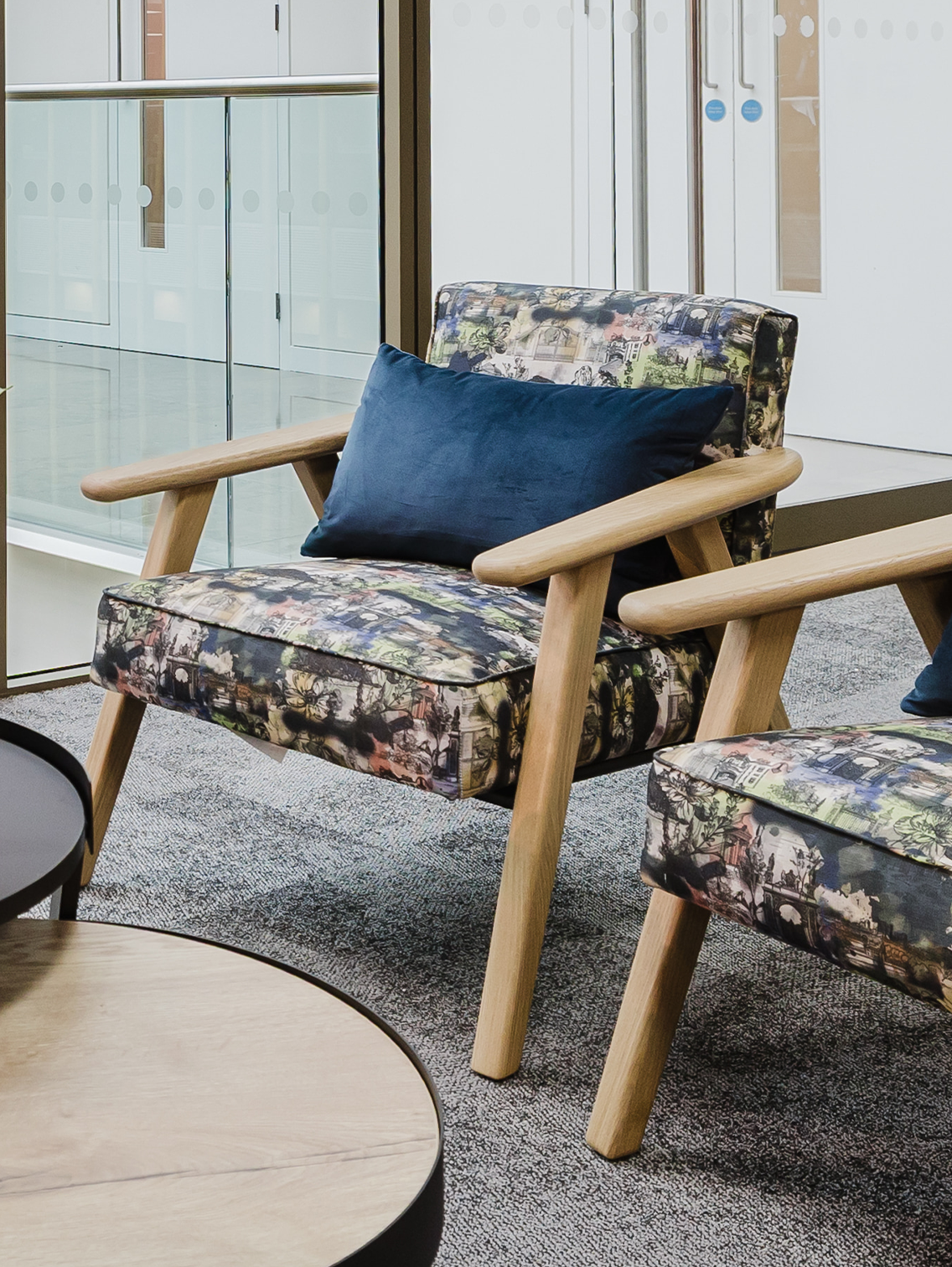 Carefully considered interior styling makes this workspace feel cosy and welcoming, whilst the multi-faith prayer room makes sure everyone feels included. London is celebrated throughout – from bespoke acoustic panelling of the city’s iconic skyline to the custom upholstery fabric created by our team, made up of London landmarks.