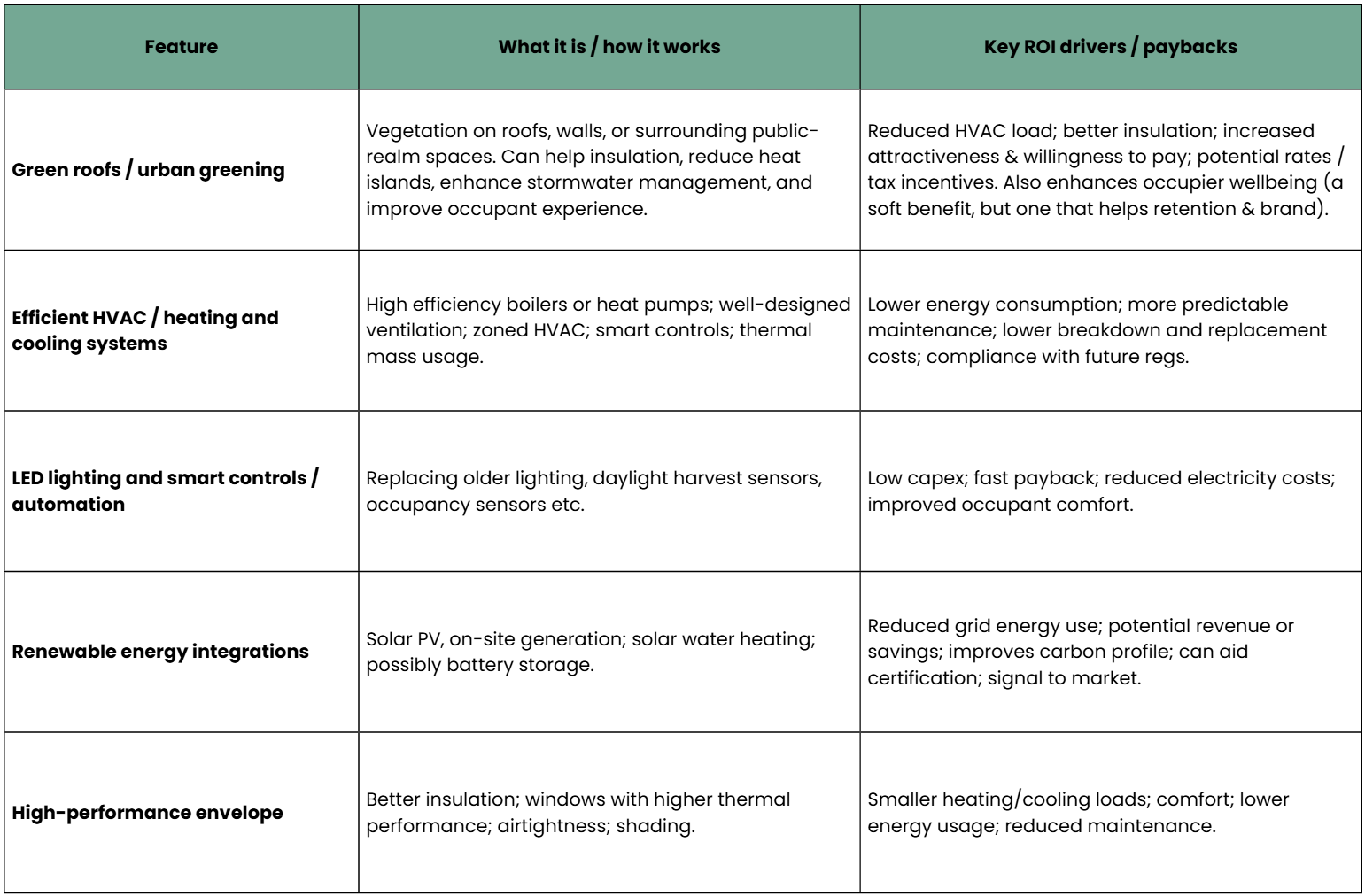 Sustainability features with ROI